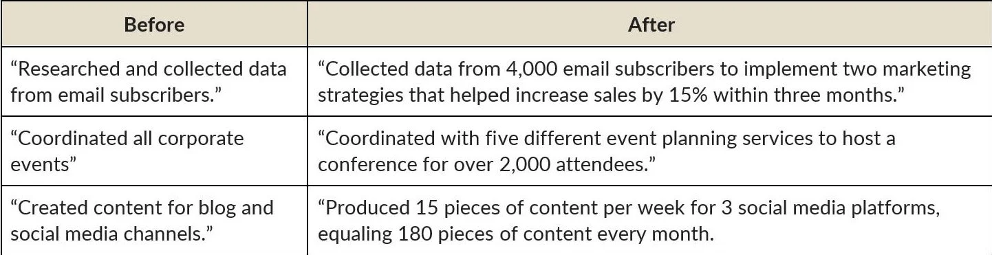 Now that you’ve pinpointed those vague, task-specific descriptions, sprinkle some results throughout each statement. Take a step back from the task and think broader. Here’s how to add results (and more flare) to some of those examples above:
